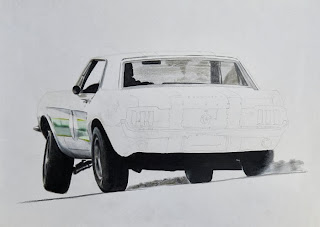 and here it is... Big Pete Geoghegan's notchback mustang! Based on a well known reference pic but colorized based on my 1:18 model of the same car. I set it up in more or less the same posture (tricky) and lighting (trickier) and will be using that for the colour. Not to difficult as the car is actually mainly an off white with green stripes.